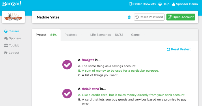 You can now sort your students by first or last name, easily read your students’ grades, and track their progress throughout Banzai. As before, you can reset any module and view the student’s answers to each question.