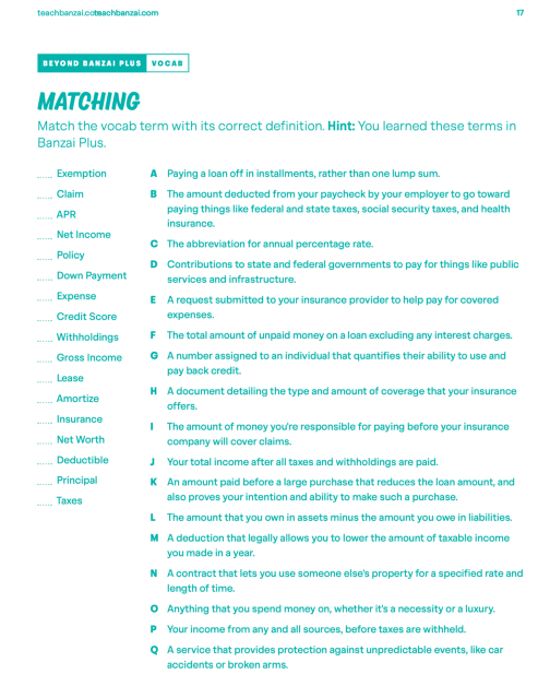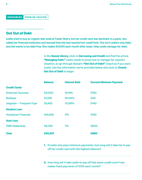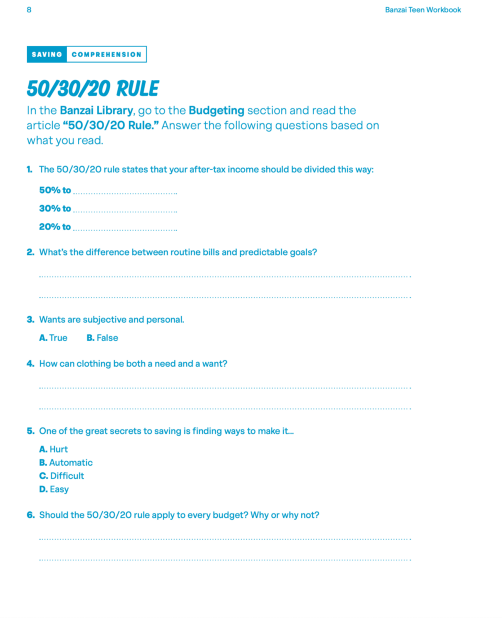 Each of the workbooks are made up of challenging yet fun questions, games, and word problems that help students think critically about finances and apply the concepts they learn through Banzai games, articles, and calculators to real-life scenarios.
