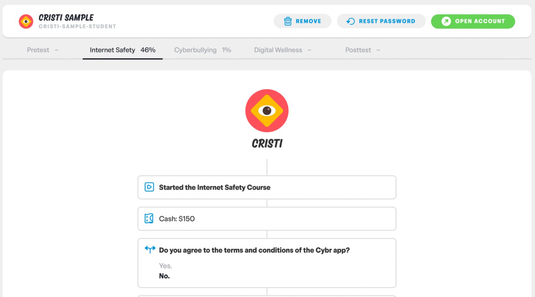 The decision tree gives teachers the ability to see a student's choices within a course, which can be extremely valuable for understanding how a student's knowledge holds up to the curriculum. We've extended that feature to all of our courses, including the Cost of College, Internet Safety, Digital Wellness, and Cyberbulling modules. This feature can be found in the teacher application.