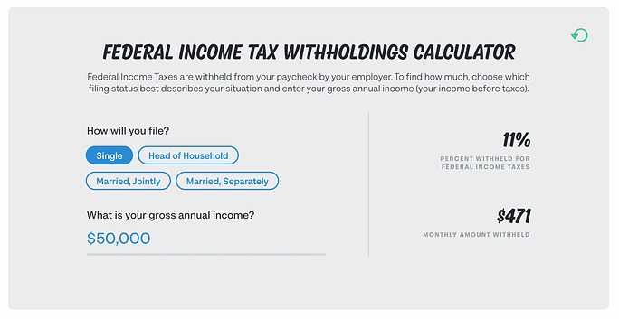 - Federal Income Tax Withholdings Calculator: Federal income taxes are a percentage of all taxable income (wages, interest earned, capital gains, etc.) that must be paid to the federal government by businesses and individuals.