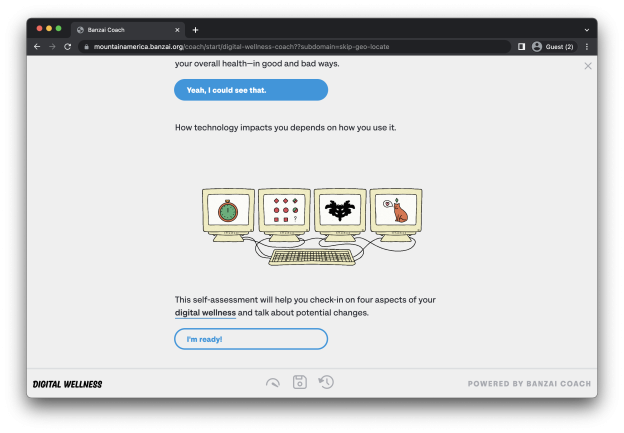 This assessment quizzes adult users about different aspects of their digital life and gives suggestions for the areas that may be a bit lacking. It focuses on 4 aspects of overall health: physical, intellectual, mental, and social.