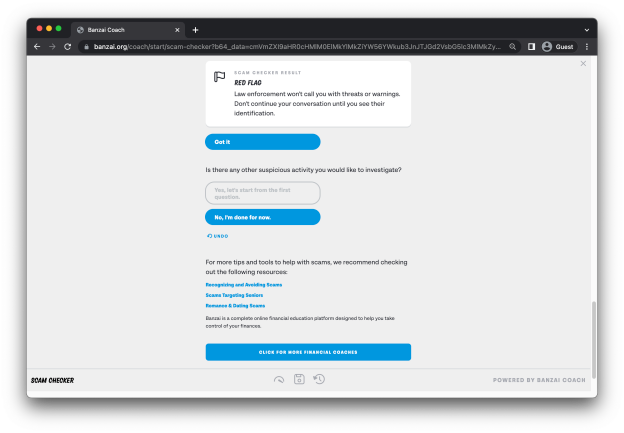 The Scam Checker Coach helps users verify if an email, voicemail, or other form of communication is legit or a scam. When completed, this Coach provides people with one of three possible results—”probably not a scam,” “worth investigating,” or “red flag.” Contextual information is offered throughout to guide people on what steps they should take next depending on their outcome.