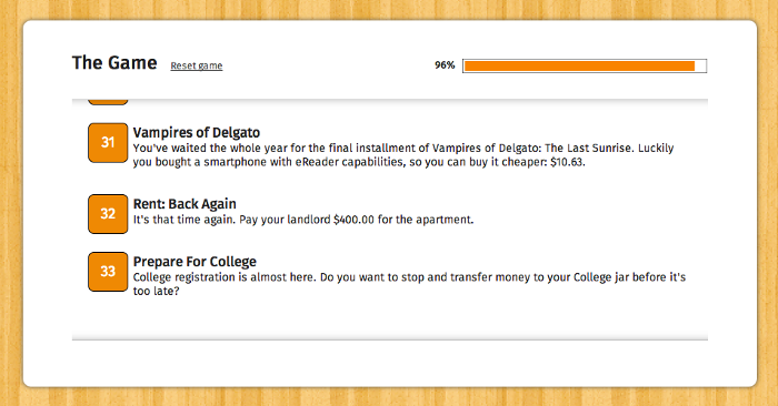 The element of surprise. The Game is fun, but it’s also insightful. As students earn money, spend, and make choices, the Game provides surprising, relevant feedback.